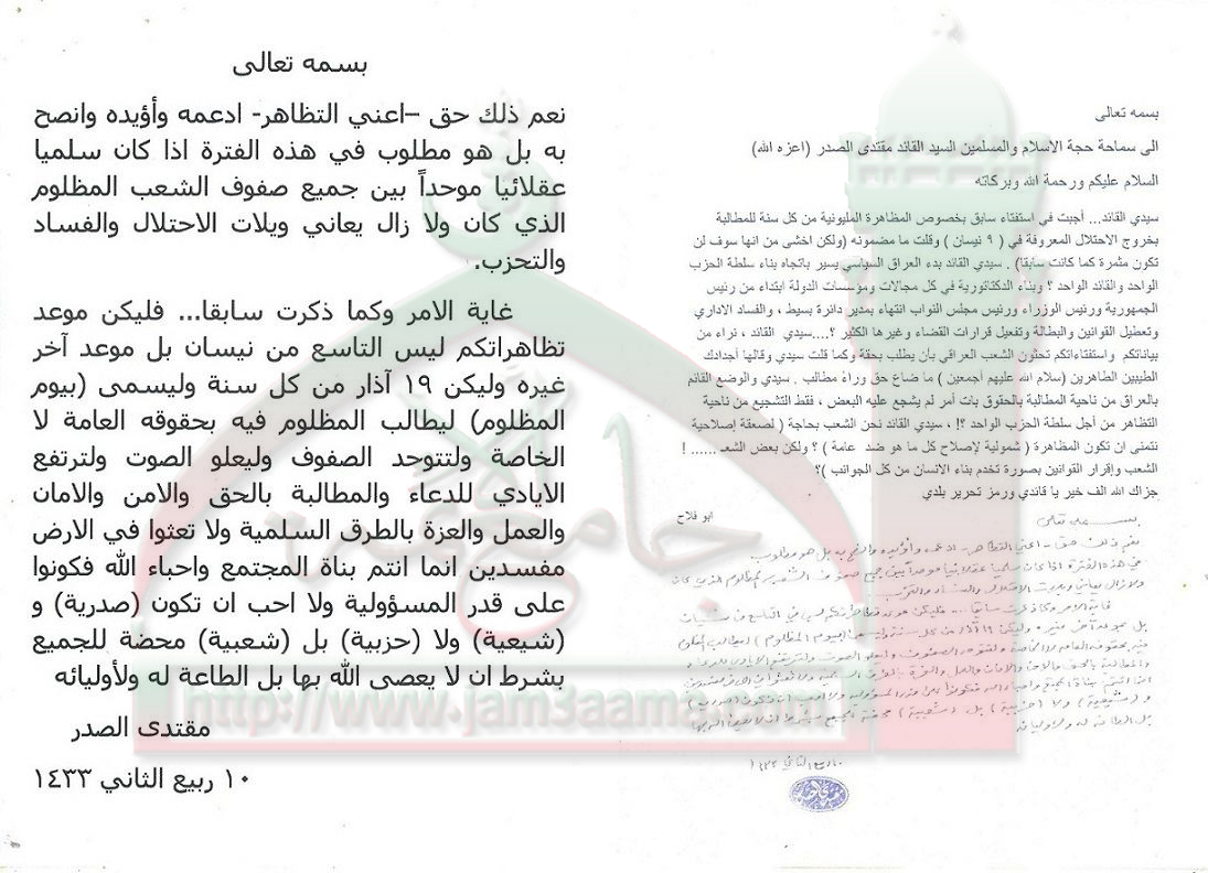 التظاهر يوم 19 اذار يوم المظلوم لاجل المطالبة بحقوق الشعب استفتاء السيد القائد مقتدى الصدر اعزه الله 6 - 3 - 2012