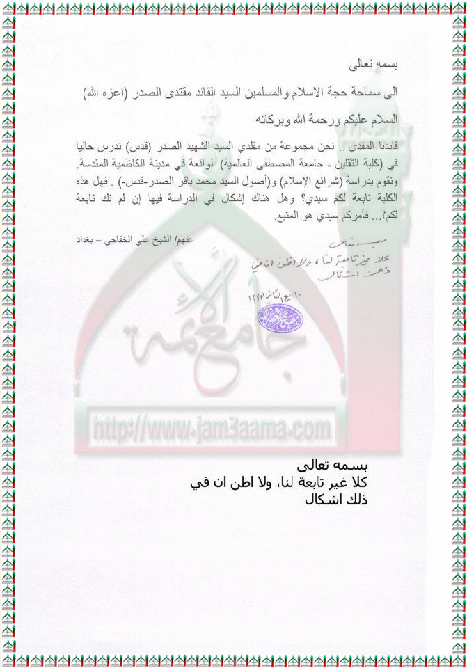 "كلية الثقلين-جامعة المصطفى العالمية "-الكاظمية غير تابعة لنا استفتاء السيد القائد مقتدى الصدر اعزه الله 6 - 3 - 2012