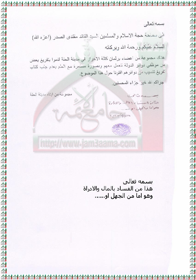 برلماني كتلة الاحرار-الحلة وتفريغهم لبعض موظفي دوائر الدولة للعمل معهم استفتاء السيد القائد مقتدى الصدر اعزه الله 7 - 3 - 2012
