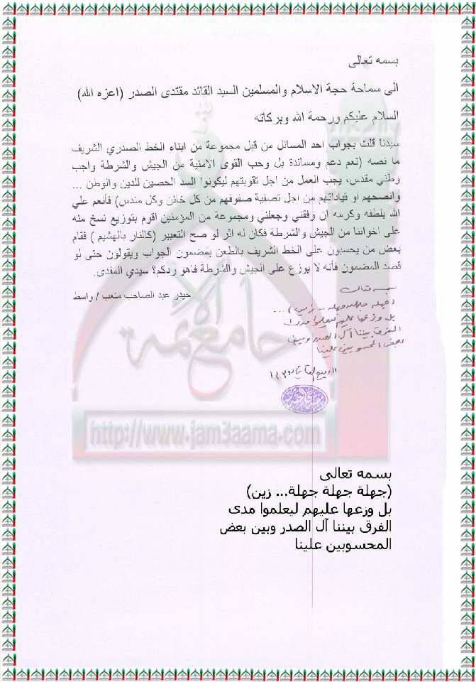 نشر وتوزيع استفتاء سماحته الذي يدعو فيه مساندة الجيش والشرطة العراقيين استفتاء السيد القائد مقتدى الصدر اعزه الله 7 - 3 - 2012