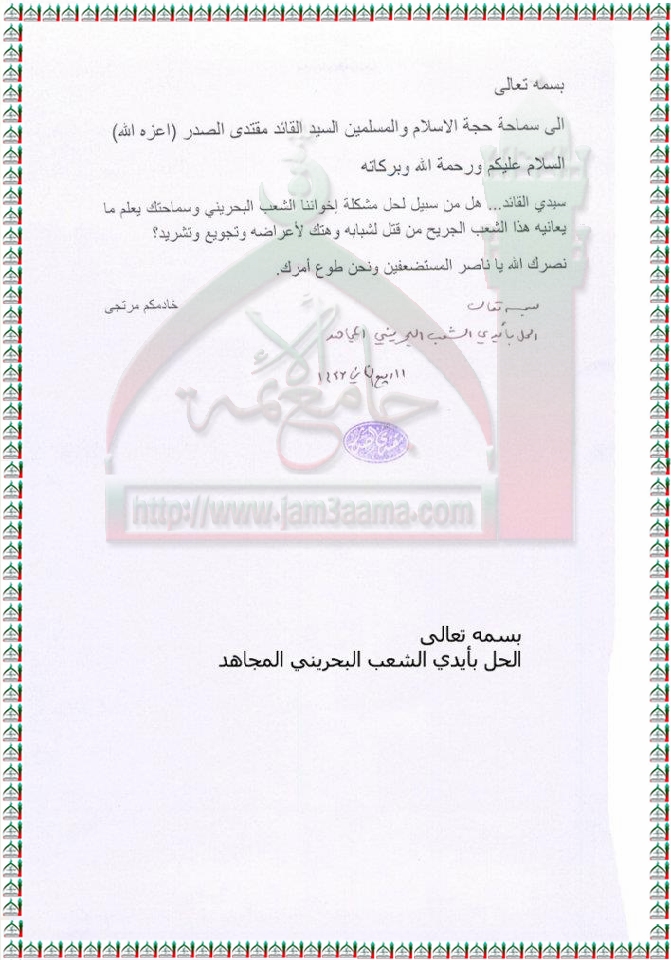 حل مشكلة البحرين بايدي الشعب البحريني المجاهد استفتاء السيد القائد مقتدى الصدر اعزه الله 7 - 3 - 2012