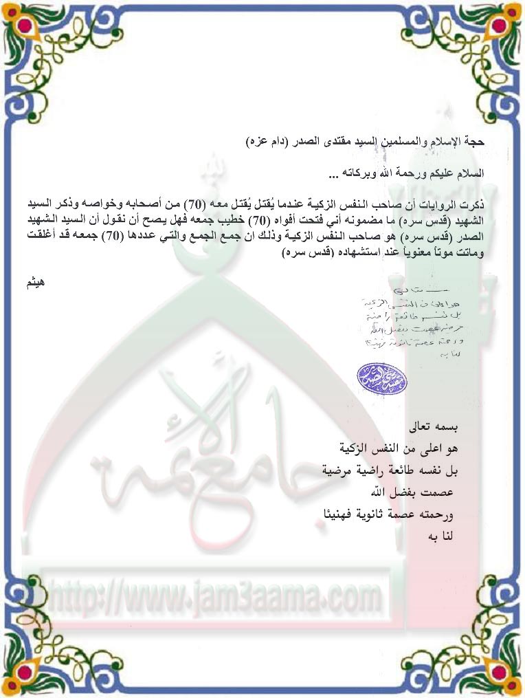 إنطباق رواية النفس الزكية على السيد الشهيد الصدر (قُدس سرُه) استفتاء السيد القائد مقتدى الصدر اعزه الله 29 - 1 - 2011