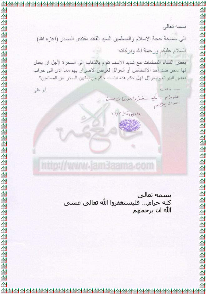 كثرة مراجعة النساء لاهل السحر استفتاء السيد القائد مقتدى الصدر اعزه الله 10- 3 - 2012