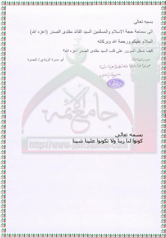 كيفية ادخال السرور على قلب سماحته استفتاء السيد القائد مقتدى الصدر اعزه الله 12- 3 - 2012