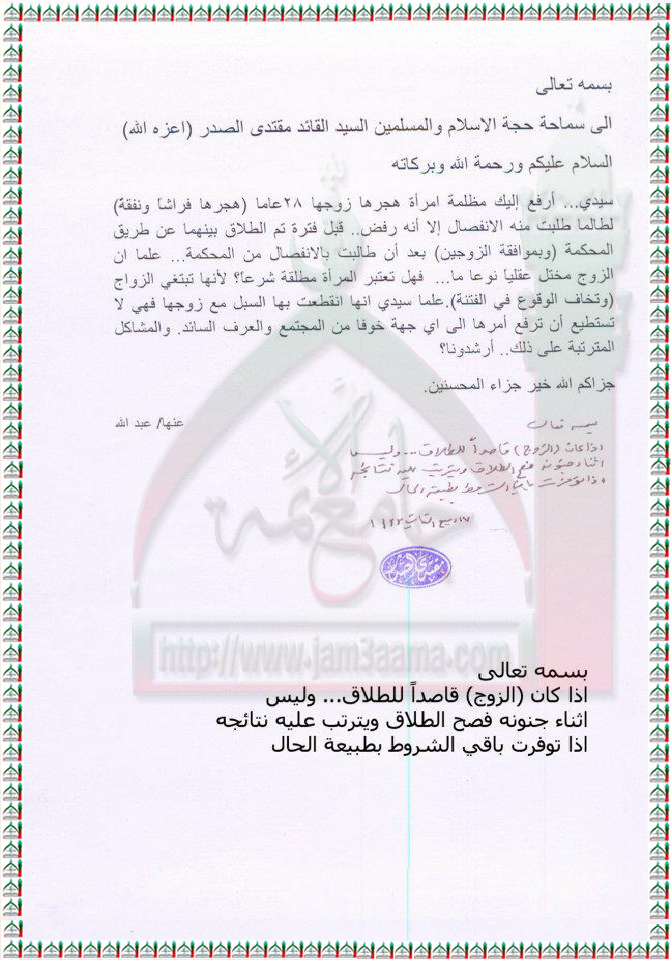طلاق امراة استفتاء السيد القائد مقتدى الصدر اعزه الله 12- 3 - 2012