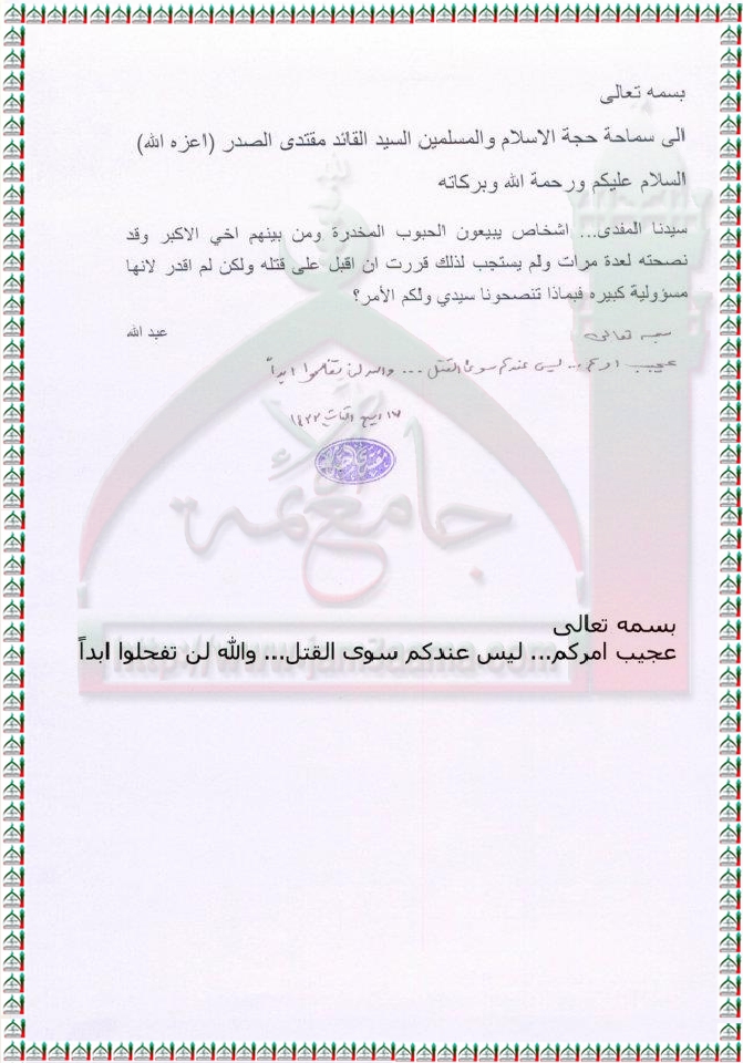 التعامل مع ممن يبيع الحبوب المخدرة استفتاء السيد القائد مقتدى الصدر اعزه الله 12- 3 - 2012
