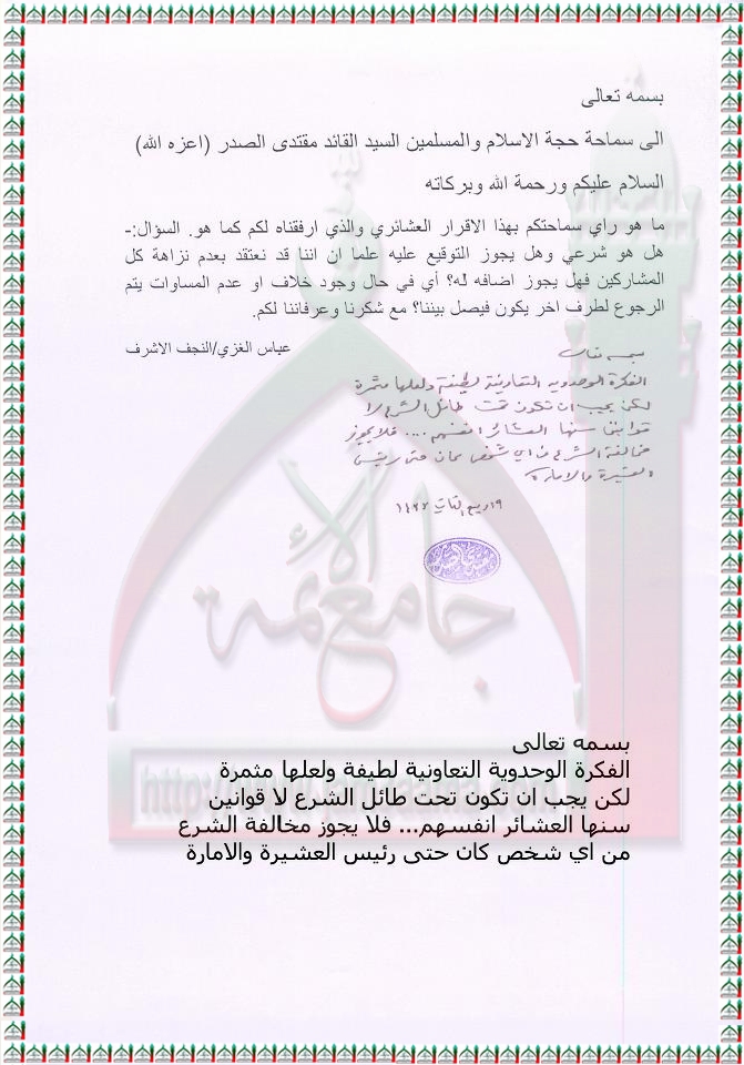 الاقرار العشائري يجب ان يكون تحت طائل الشرع استفتاء السيد القائد مقتدى الصدر اعزه الله 13- 3 - 2012