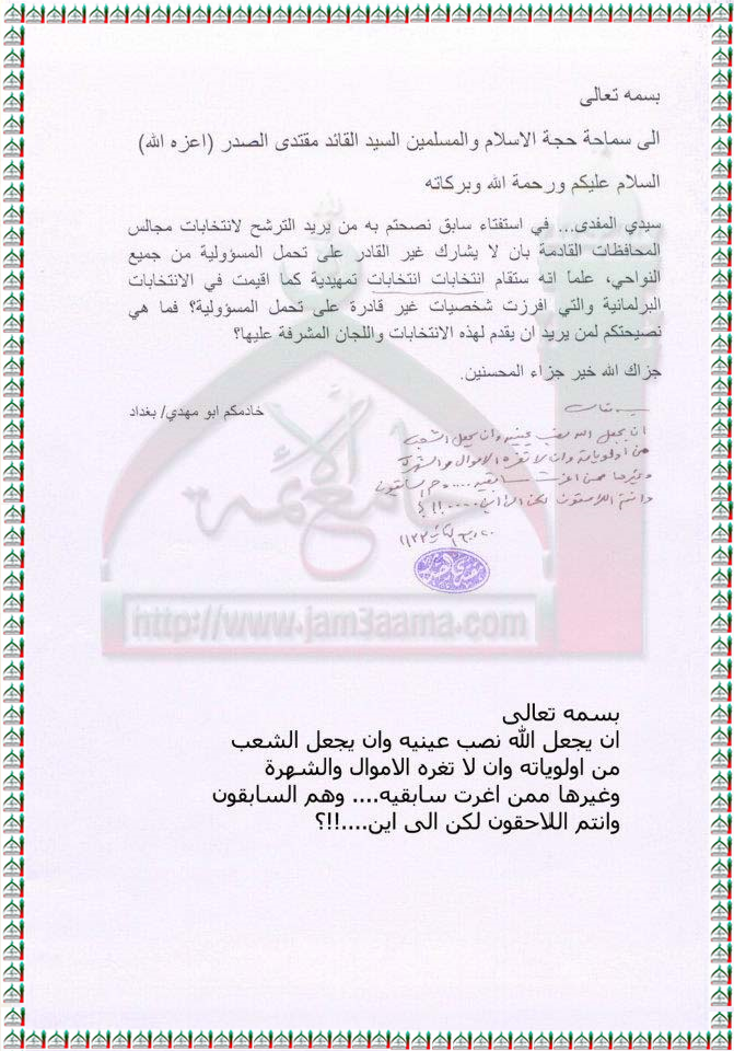 الاشتراك بالانتخابات واللجان المشرفة عليها استفتاء السيد القائد مقتدى الصدر اعزه الله 14- 3- 2012