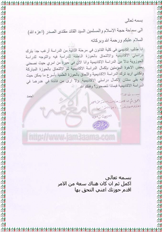 ترك الدراسة الاكاديمية والألتحاق بالحوزة العلمية اسفتاء السيد القائد مقتدى الصدر اعزه الله 15 - 3- 2012