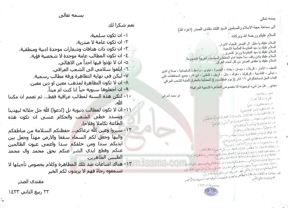 نصائح وتوجيهات ودعاء للمتظاهرين في يوم المظلوم استفتاء السيد القائد مقتدى الصدر اعزه الله 16-3-2012