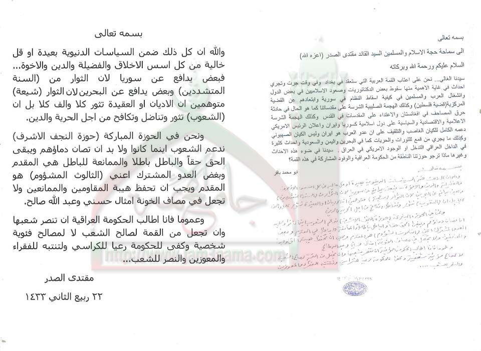 القمة العربية وموقف الحوزة الناطقة منها وما يجري من احداث في الوطن العربي وثورات الشعوب العربيةاستفتاء السيد القائد مقتدى الصدر اعزه الله 17 - 3 - 2012