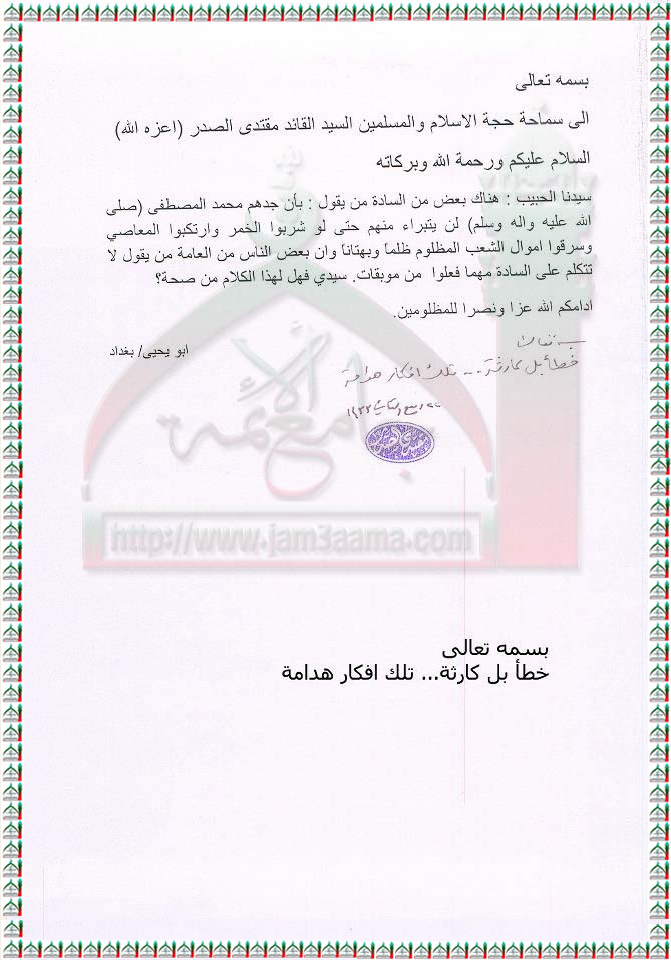 قول بعض السادة بان جدهم النبي محمد صلى الله عليه واله لن يتبراء منهم حتى لو شربوا الخمر وارتكبوا المعاصي استفتاء السيد القائد مقتدى الصدر اعزه الله 17-3-2012