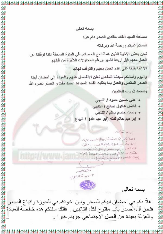 توبة مجموعة من العصائب استفتاء السيد القائد مقتدى الصدر 18-3-2012