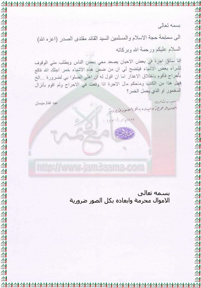 حكم كذب سائق الاجرة على بعض الناس الذين يقومون بشراء الخمر والمال الماخوذ منهم استفتاء السيد القائد مقتدى الصدر اعزه الله 19-3-2012