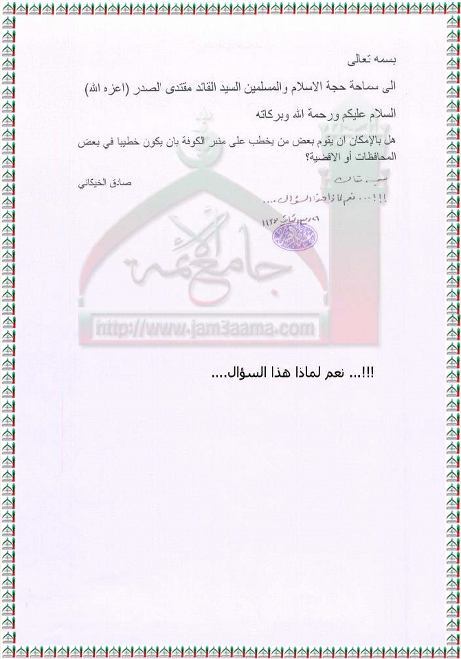 امكانية قيام بعض من يخطب من منبر الكوفة بان يكون خطيباً بالمحافظات والاقضية استفتاء السيد القائد مقتدى الصدر اعزه الله 20 - 3 - 2012