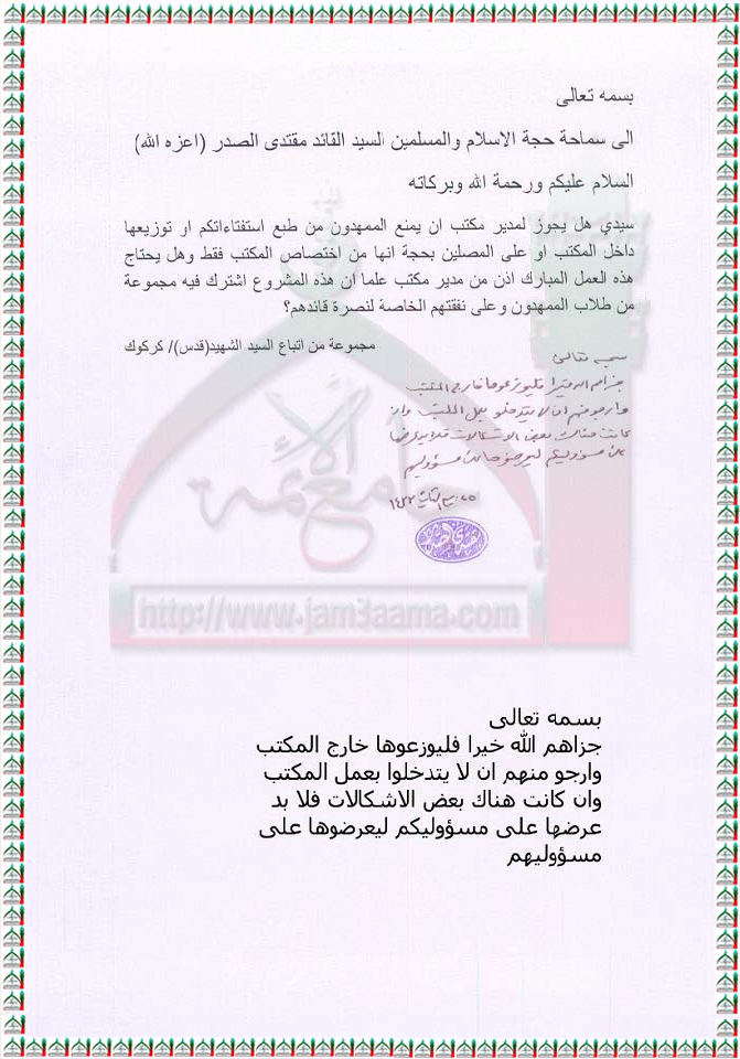 طبع وتوزيع الاستفتاءات من قبل الممهدون داخل المكتب استفتاء السيد القائد مقتدى الصدر اعزه الله 20- 3 - 2012