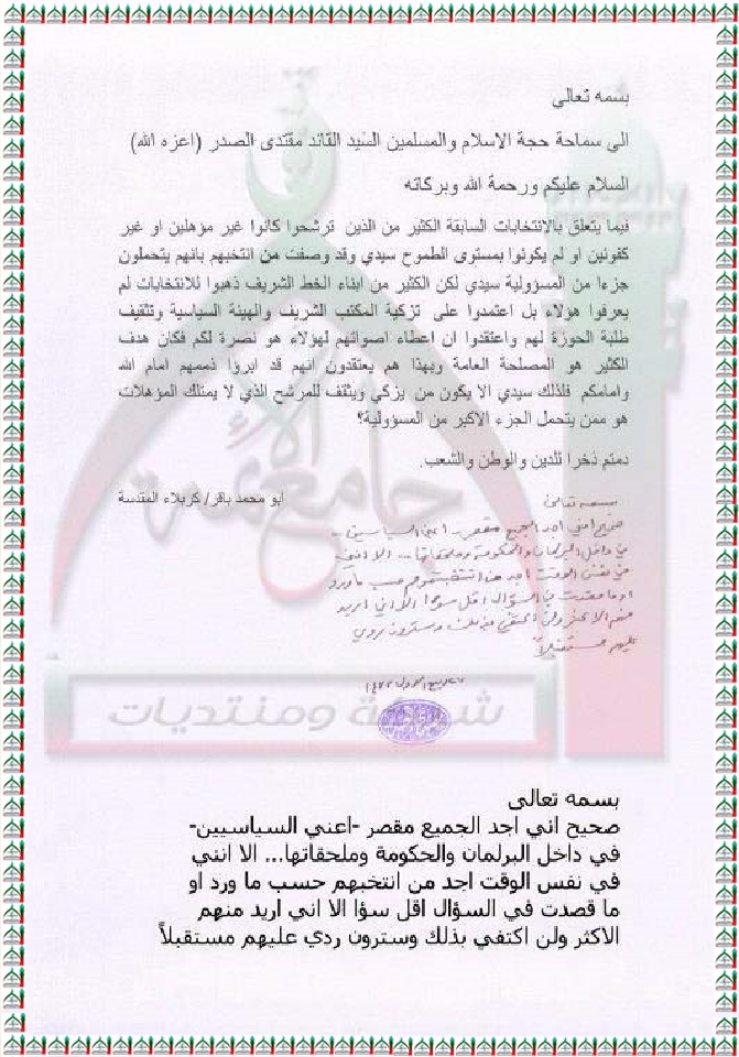 تقصير السياسيين داخل البرلمان والحكومة وملحقاتها استفتاء السيد القائد مقتدى الصدر اعزه الله 21-3-2012