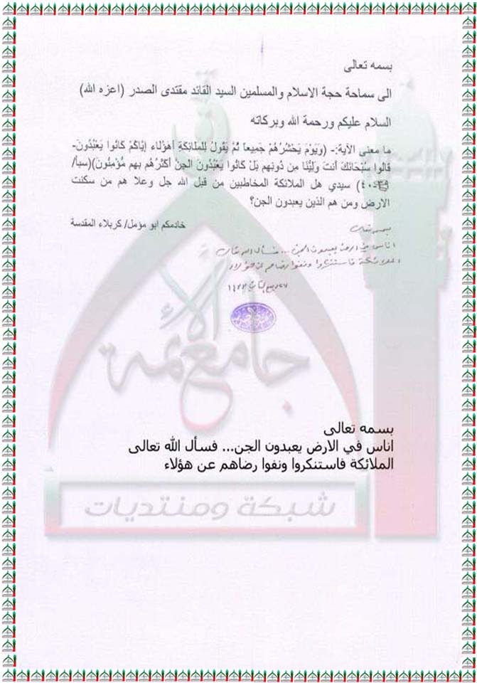 معنى الاية (وَيَوْمَ يَحْشُرُهُمْ جَمِيعاً ثُمَّ يَقُولُ لِلْمَلَائِكَةِ أَهَؤُلَاء إِيَّاكُمْ كَانُوا يَعْبُدُونَ }سبأ 40-41 استفتاء السيد القائد مقتدى الصدر اعزه الله 21-3-2012
