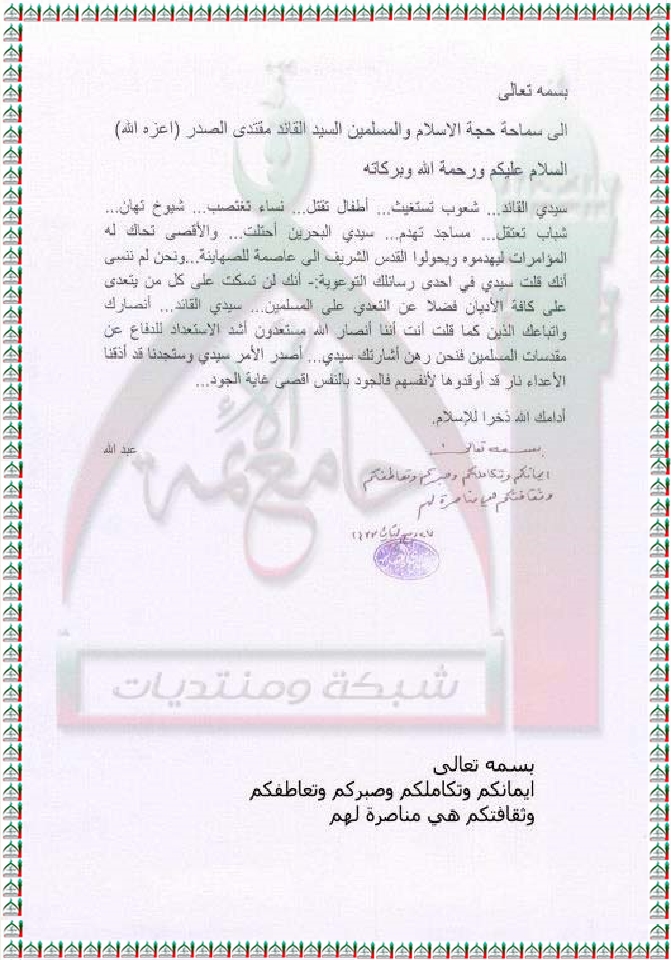 استغاثة واستعداد المؤمنين للدفاع عن البحرين والاقصى وباقي المقدسات استفتاء السيد القائد مقتدى الصدر اعزه الله 21-3-2012