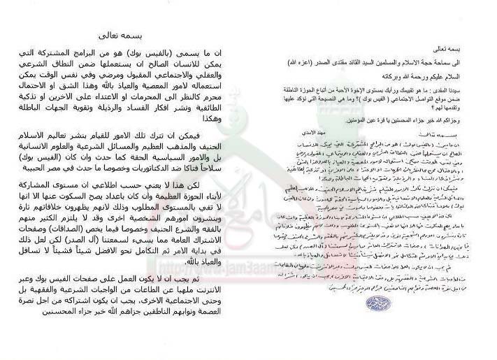 نصيحة سماحته لمن يعمل على موقع التواصل الاجتماعي ( الفيس بوك ) من ابناء الحوزة الناطقة استفتاء السيد القائد اعزه الله 22 - 3 - 2012