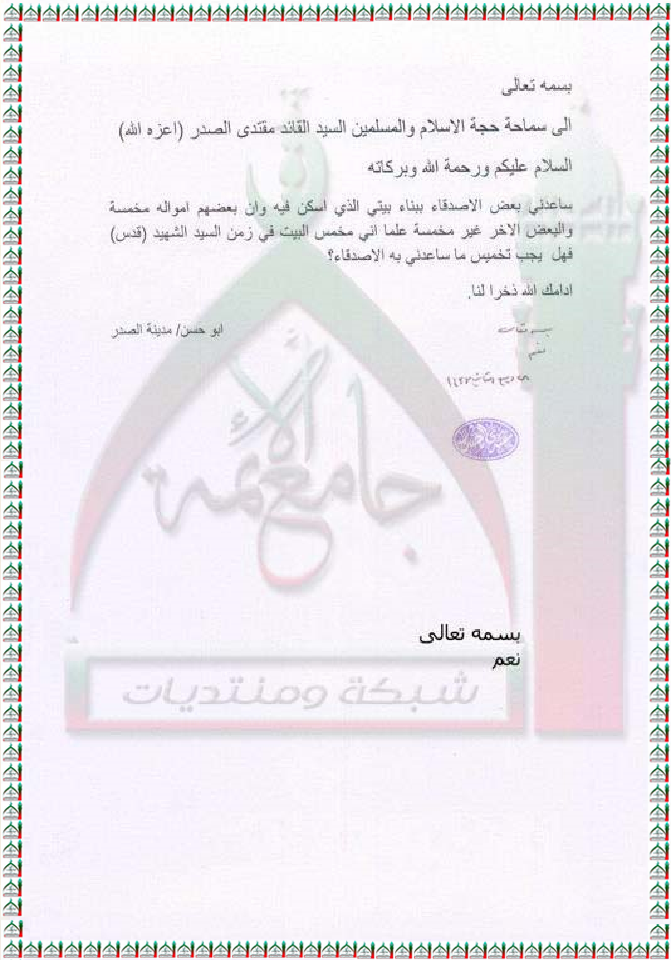 وجوب الخمس للاموال المشتركة في بناء البيت استفتاء السيد القائد مقتدى الصدر اعزه الله 22-3-2012
