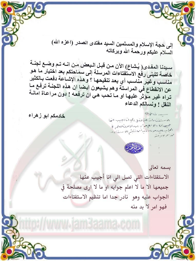 لجنة لتنظيم استفتاءات سماحته(استفتاء للسيد القائد بتاريخ 2-1-2011)