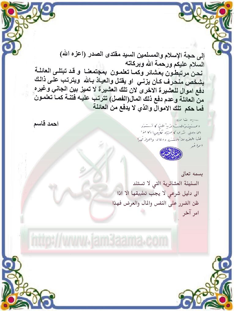 لايجب الالتزام بالسنينة العشائرية غير الشرعية(استفتاء للسيد القائد بتاريخ 1-1-2011)