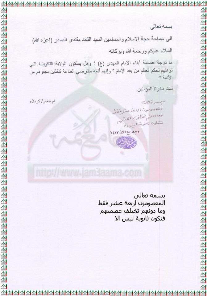 درجة عصمة ابناء الامام المهدي عج استفتاء السيد القائد مقتدى الصدر اعزه الله 24 - 3 - 2012