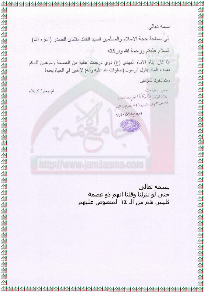 اذا كان ابناء الامام المهدي عج ذوي درجات عالية من العصمة فلماذا يقول رسول الله ص لا خير بالحياة بعده استفتاء السيد القائد مقتدى الصدر اعزه الله 24 - 3 - 2012