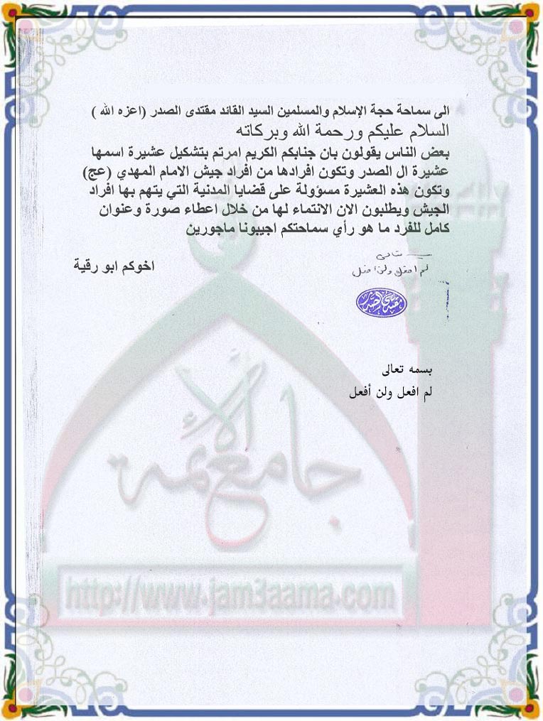 عدم تشكيل عشيرة ال الصدر(استفتاء للسيد القائد بتاريخ14- 1-2011)