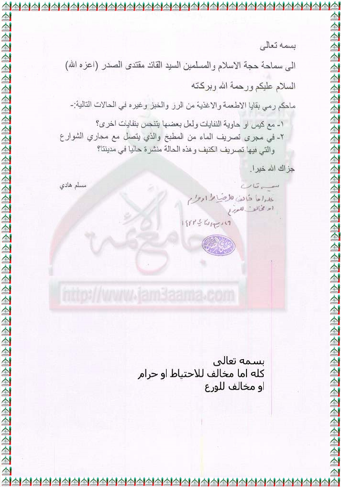 رمي بقايا الاطعمة والاغذية من الخبز والرز استفتاء السيد القائد مقتدى الصدر اعزه الله 24 - 3 - 2012
