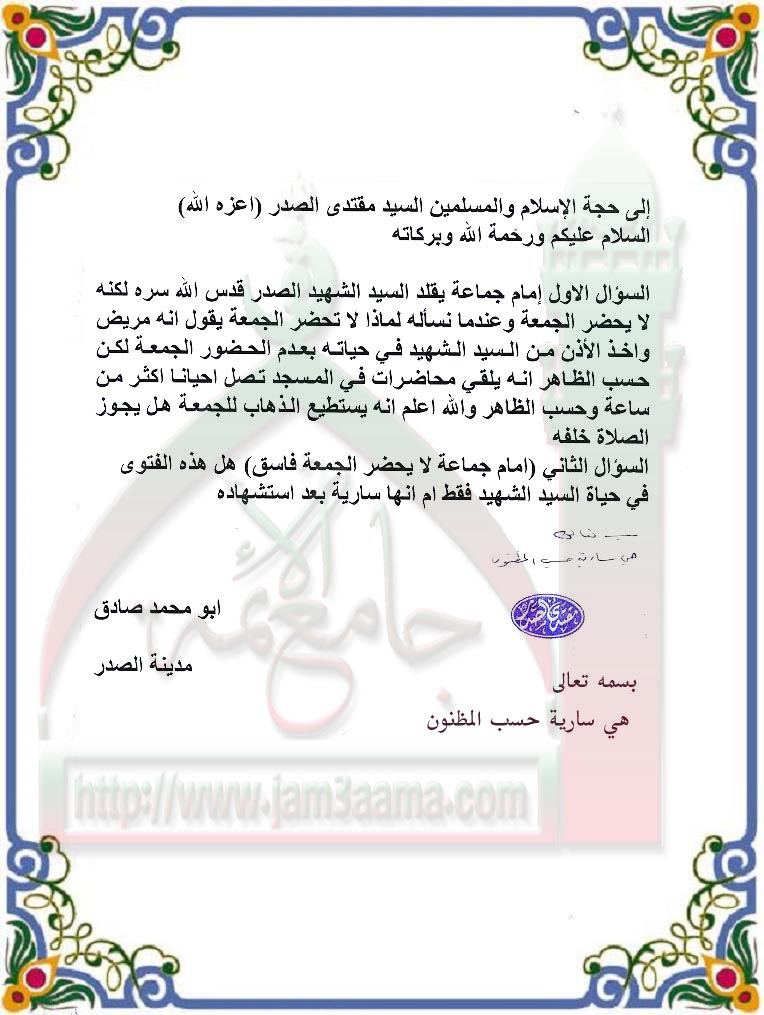 امام الجماعة الذي لا يحضر الجمعة فاسق (استفتاء للسيد القائد بتاريخ14- 1-2011)