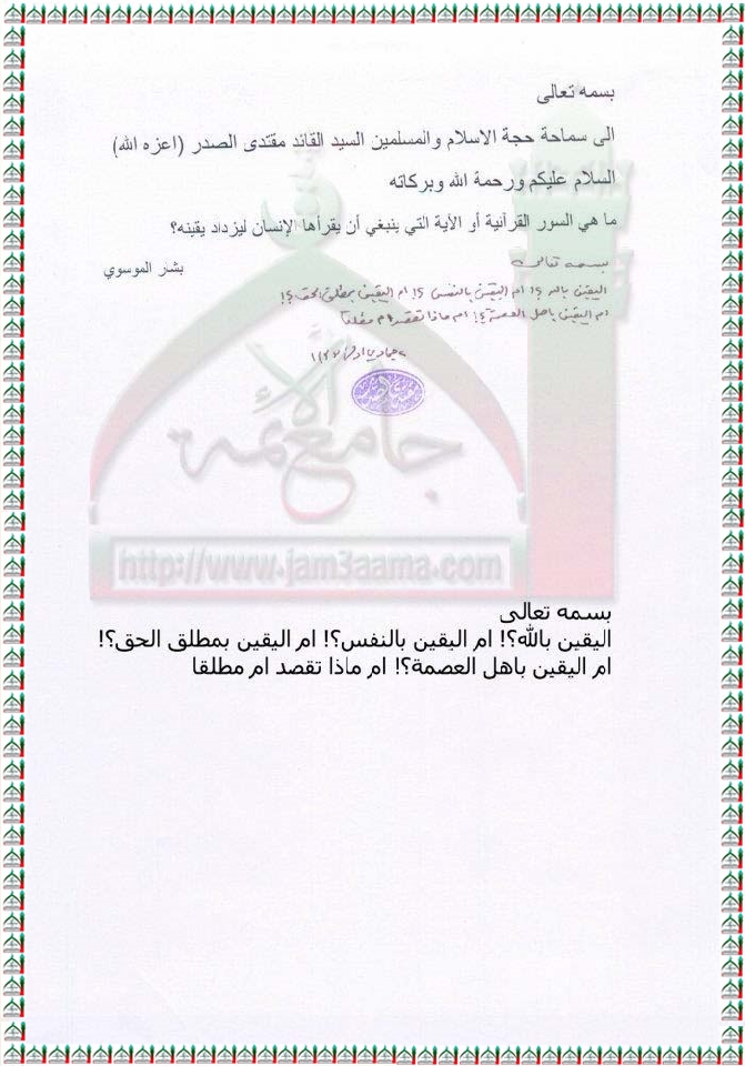 الاية القرانية التي ينبغي على الانسان قرائتها ليزداد يقينه استفتاء السيد القائد مقتدى الصدر اعزه الله 26 - 3 - 2012