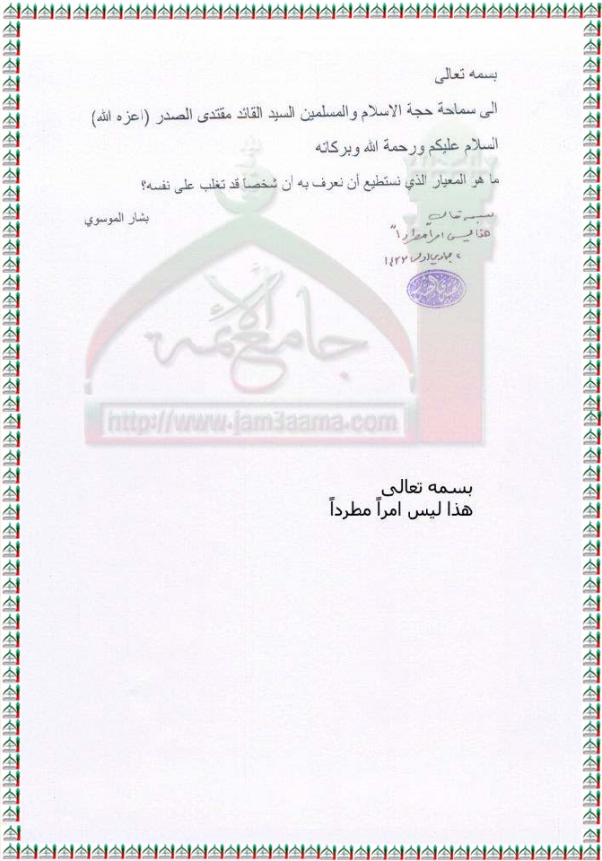 المعيار الذي من خلاله يعرف الشخص بانه تغلب على نفسه استفتاء السيد القائد مقتدى الصدر اعزه الله 26 - 3 - 2012