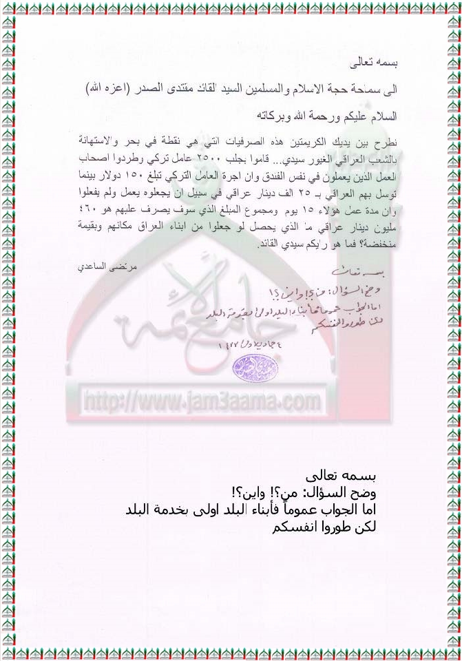 تشغيل عمال اتراك بدل المواطن العراقي استفتاء السيد القائد مقتدى الصدر اعزه الله 27 -3 -2012