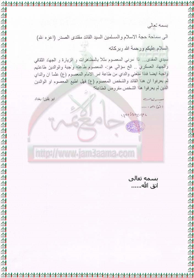 لمن تجب الطاعة للمعصوم ام للوالدين اذا اصدر المعصوم امراً كالمظاهرات مثلاً !! استفتاء السيد القائد مقتدى الصدر اعزه الله 27 -3 -2012
