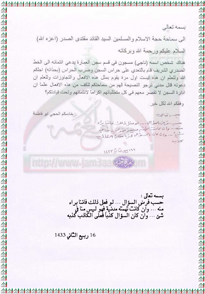 المدعو ( ناجي ) المسجون في سجن العمارة وسوء تعامله مع حراس السجن استفتاء السيد القائد مقتدى الصدر اعزه الله 29 - 3 - 2012