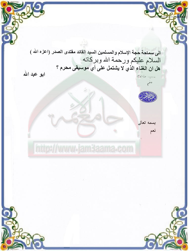 حرمة الغناء الغير مشتمل على الموسيقى (استفتاء للسيد القائد بتاريخ14- 1-2011)