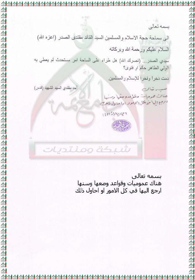 المستحدثات بعد السيد الشهيد الصدر قدس سره استفتاء السيد القائد مقتدى الصدر اعزه الله 29- 3 - 2012