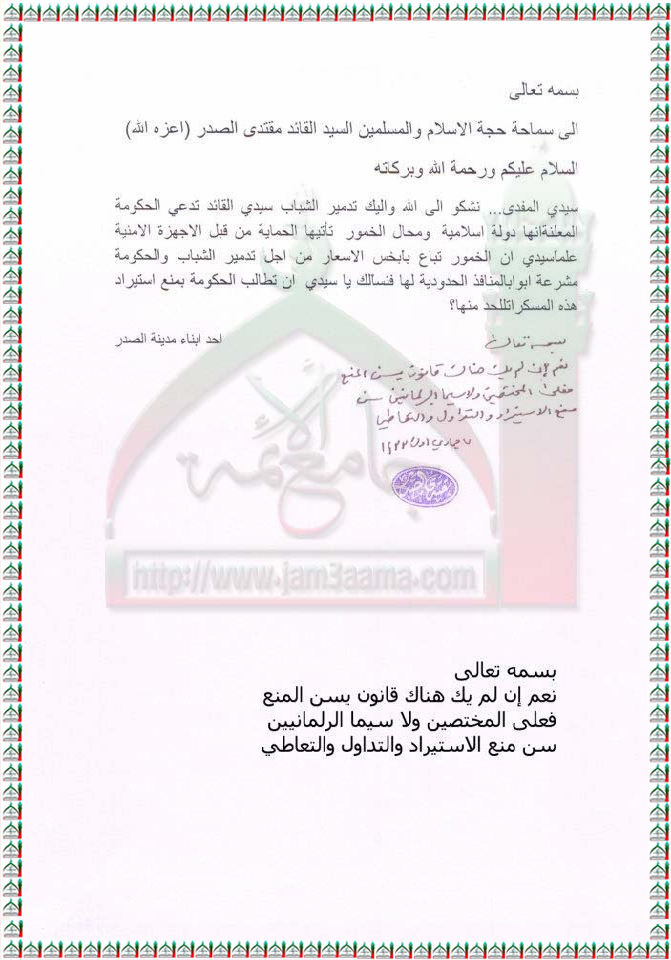 مطالبة البرلمانيين بسن قانون يمنع استيراد وتداول وتعاطي الخمور استفتاء السيد القائد مقتدى الصدر اعزه الله 31 - 3 - 2012