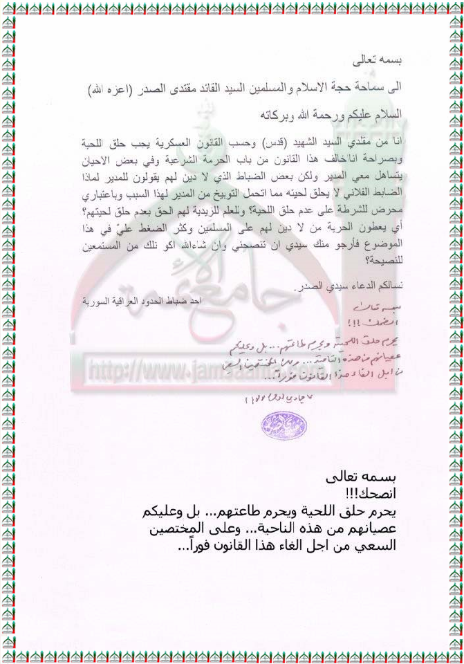 على المختصين السعي لالغاء قانون حلق اللحية لمنتسبي القوى الامنية استفتاء السيد القائد مقتدى الصدر اعزه الله 31 - 3 - 2012