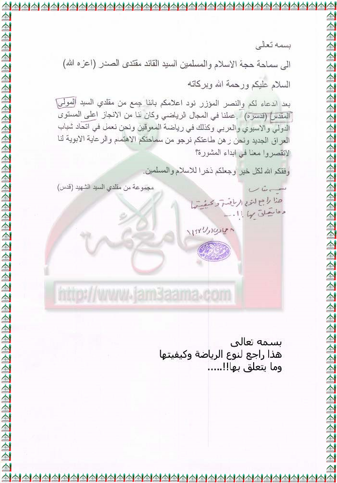 عمل مجموعة من مقلدي السيد الشهيد في المجال الرياضي استفتاء السيد القائد مقتدى الصدر اعزه الله 1 - 4 - 2012