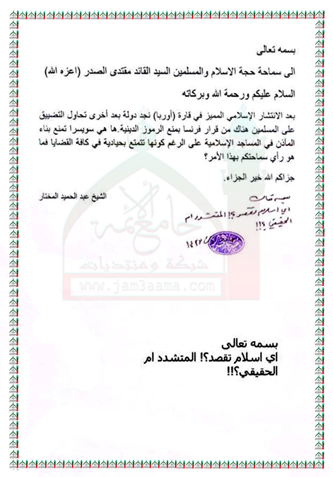 التضيق على المسلمين بعد انتشار الاسلام في قارة اوربا استفتاء السيد القائد مقتدى الصدر اعزه الله 1 - 4 - 2012