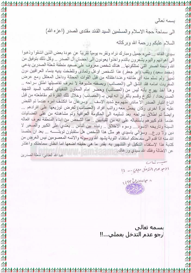 المدعو محمد سعيد وقبول توبته في حال تقديم لسماحته استفتاء بهذا الخصوص استفتاء السيد القائد مقتدى الصدر اعزه الله 1 - 4 - 2012