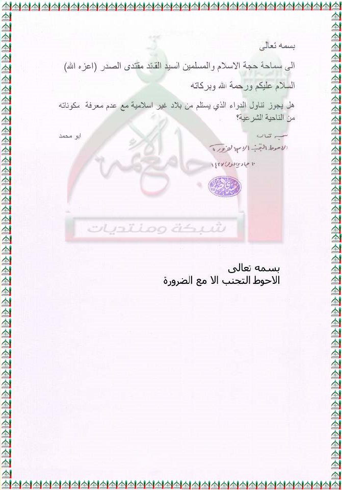 حكم تناول الدواء ذو المنشا غير الاسلامي استفتاء السيد القائد مقتدى الصدر اعزه الله2 -4- 2012