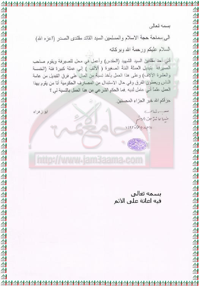 تبديل العملة ذات الفئة الصغيرة بالكبيرة مع الفرق استفتاء السيد القائد مقتدى الصدر اعزه الله 4 -4 - 2012