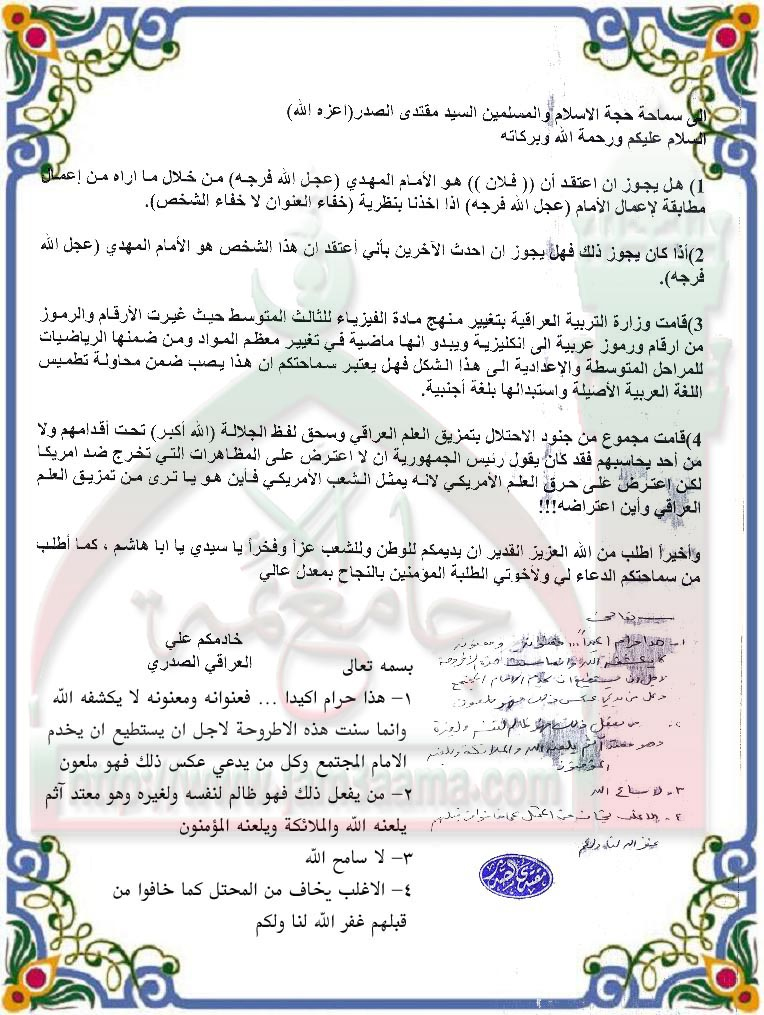 بعض الامور التي تخص الامام المهدي ( ع ) استفتاء سماحة السيد القائد مقتدى الصدر اعزه الله 14 - 1 - 2011