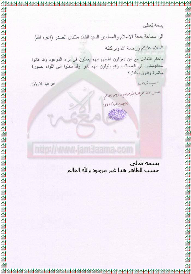 التعامل مع من يعرّفون انفسهم بانهم يعملون في لواء اليوم الموعود وكانوا يعملون سابقاً بالعصائب استفتاء السيد القائد مقتدى الصدر اعزه الله 6 - 4 - 2012
