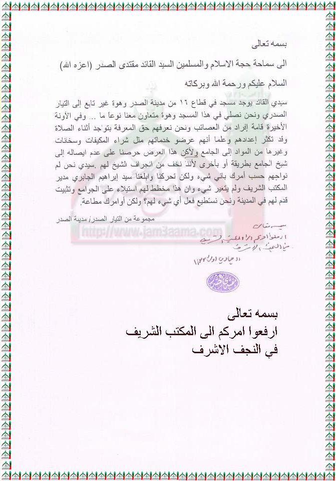 محاولة المنشقين السيطرة على مسجد في قطّاع 16 -مدينة الصدر استفتاء السيد القائد مقتدى الصدر اعزه الله7 - 4 - 2012