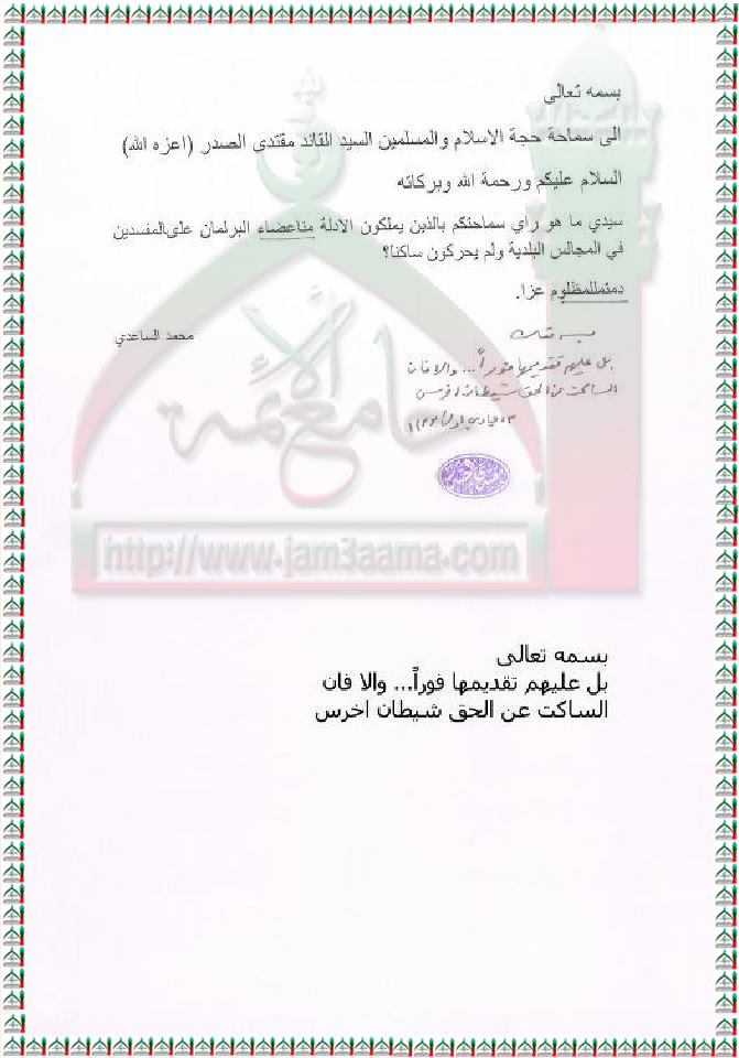 حول بعض اعضاء البرلمان ممن يملكون الادلة ضد المفسدين من اعضاء المجالس البلدية استفتاء السيد القائد مقتدى الصدر اعزه الله 8-4-2012